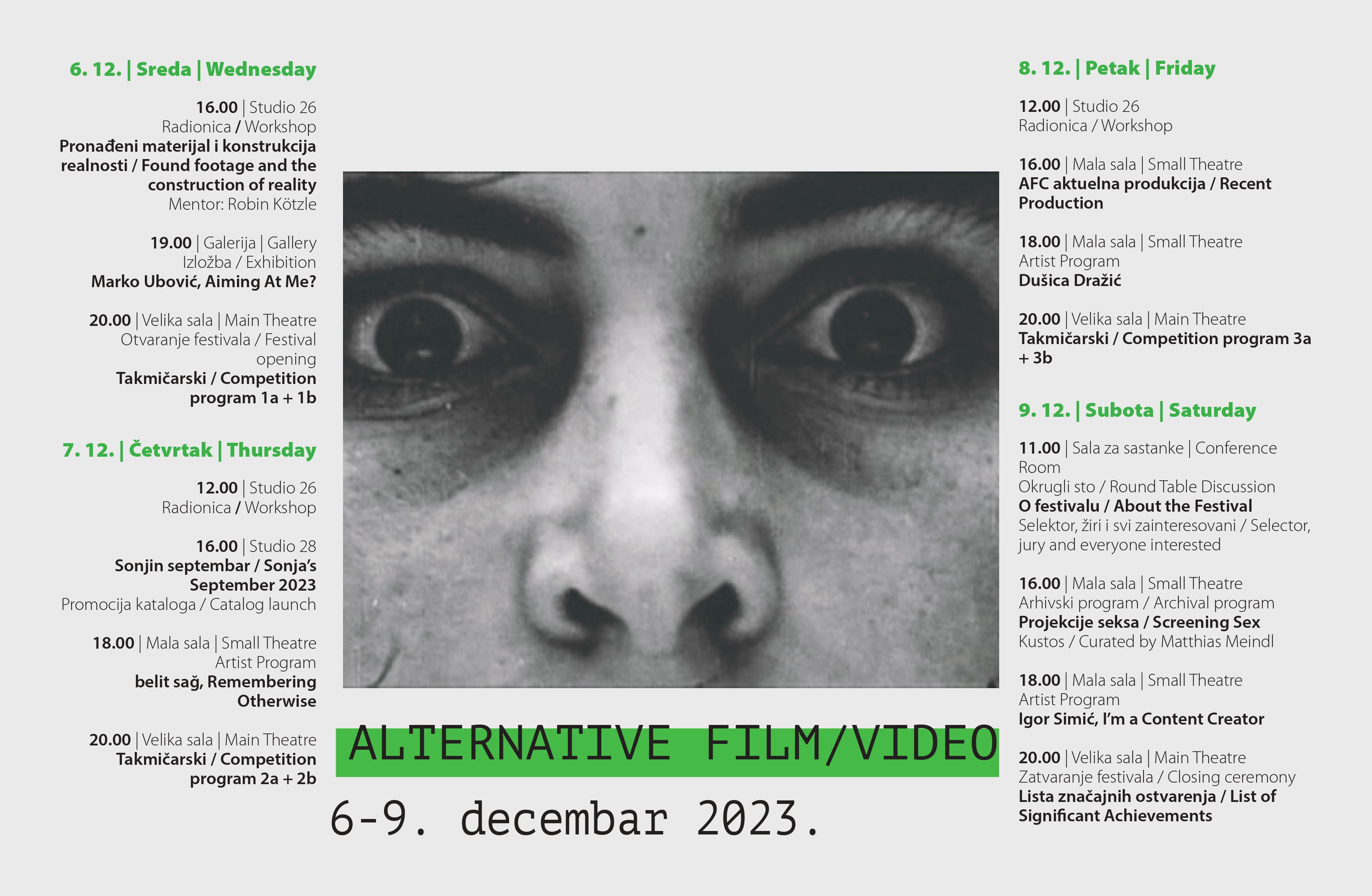 Am diesjährigen "Alternative Film/Video Festival" (6.-9. Dezember 2023) findet am 9. Dezember ein von Matthias Meindl kuratiertes Screening mit dem Titel ‘Screening Sex’, and Pornographic and Anti-Pornographic Images in Yugoslav Alternative Film since the 1970s statt.